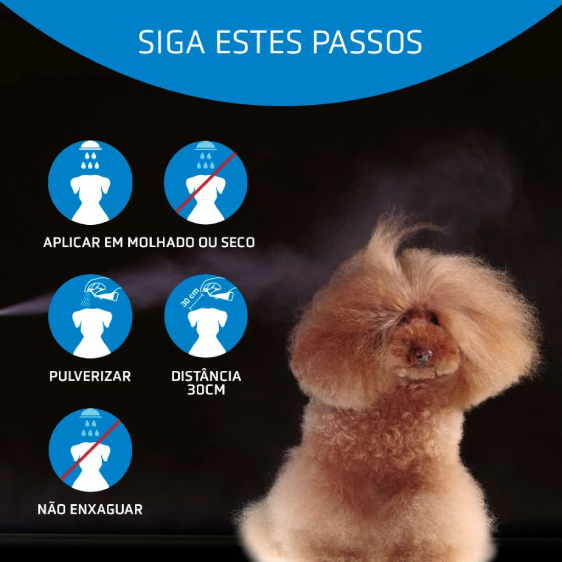 → Pode ser utilizado tanto em pelo molhado como em seco. Se for aplicado no pelo molhado, deve ser após o banho do nosso cão, quando o pelo estiver limpo, mas antes de terminar de secá-lo. Em pelo seco, durante as escovagens de rotina.