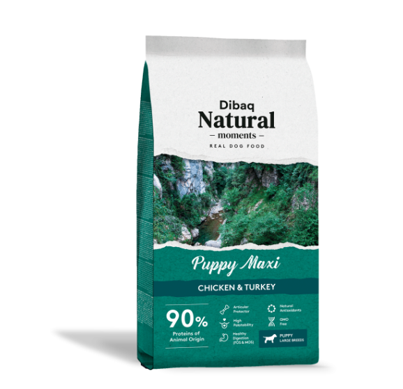 Alimento natural para cachorros e cadelas de raças grandes elaborado com Frango e Peru, protetores de articulações, plantas naturais, extrato de mandioca para neutralizar odores, prebióticos e antioxidantes naturais.