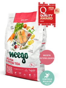 Weego® Salmon & Green Tea é um alimento seco, natural, completo e equilibrado à base de salmão, sem cereais, adaptado para gatos adultos esterilizados de qualquer raça ou tamanho.